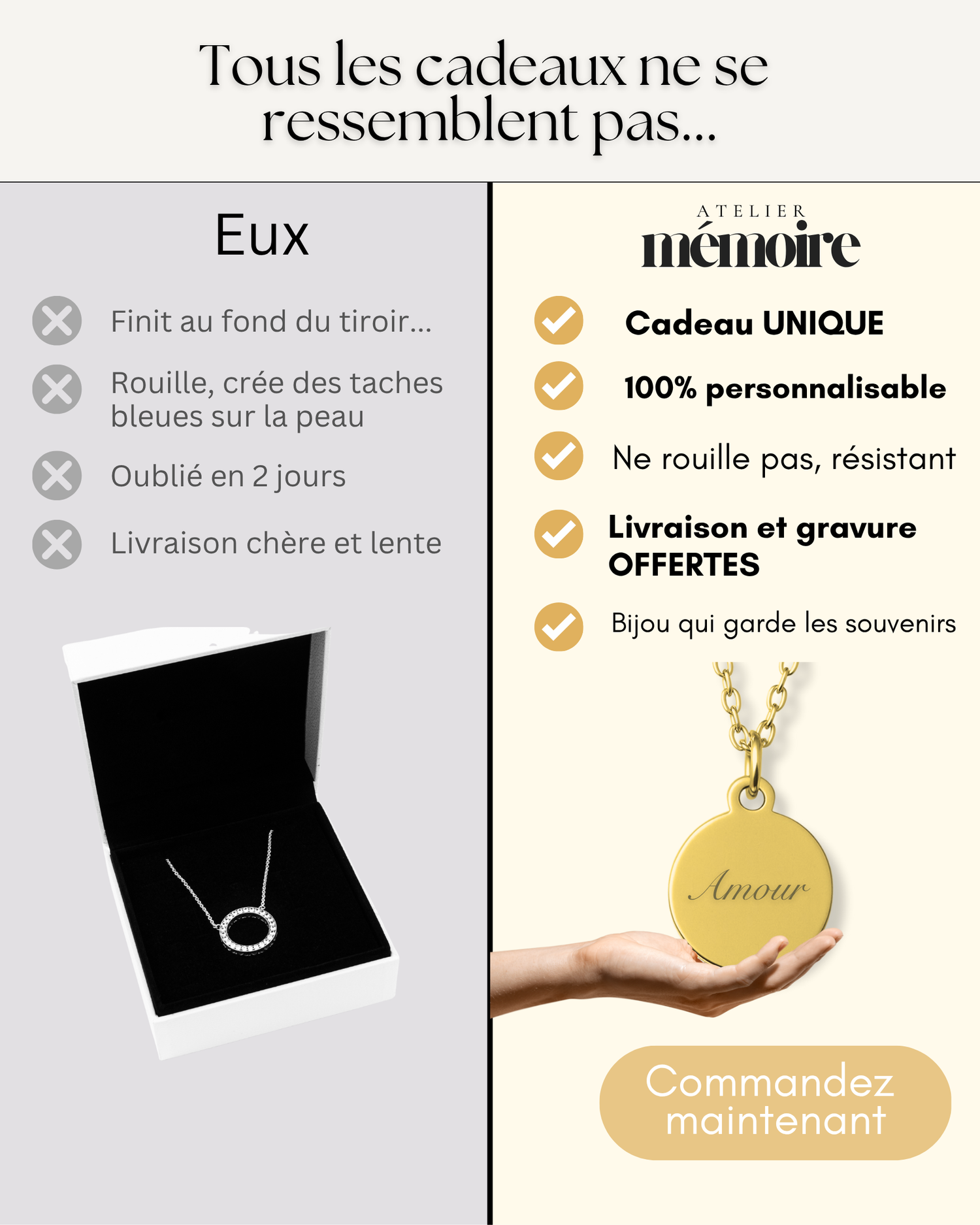 Chez Atelier Mémoire, chaque pendentif est gravé sur-mesure et livré dans un packaging élégant, déjà prêt à être offert.